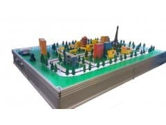 包括道路、道路LED照明、红绿灯、道闸、车库、公交站台、广告牌、树林草地、智能建筑等场景模拟,详见整体规划效果图中所示。