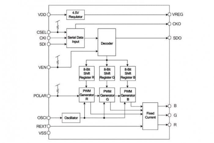 4、RGB三色LED输出,8 Bit(256级)色彩设定,5 Bit(32级)色彩设定,5 Bit(32级)亮度调整
