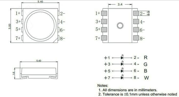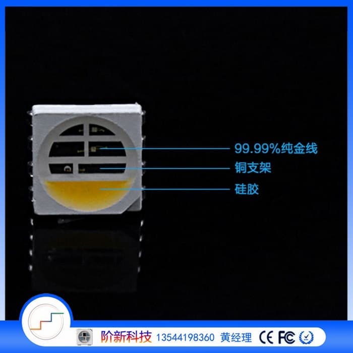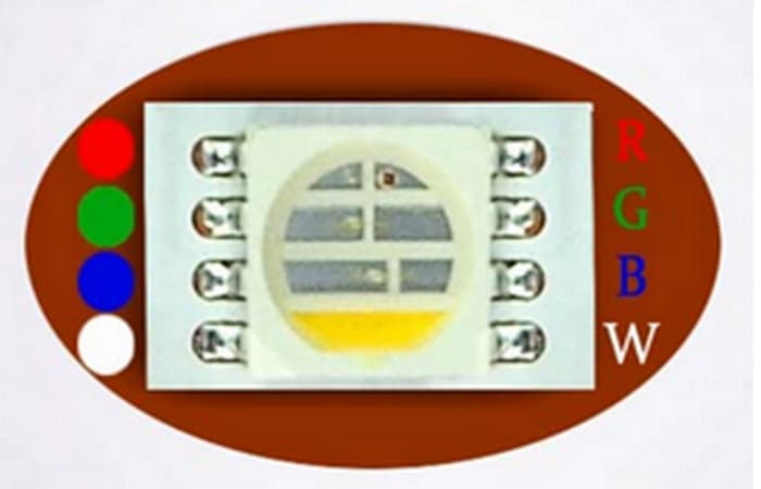 每个RGBW 灯珠内置红、绿、蓝、正白(暖白、冷白)晶元芯片各一颗。