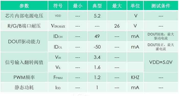 SK6812内置IC灯珠电气参数(如无特殊说明,TA=-20~+70℃,VDD=4.5~5.5V,VSS=0V):