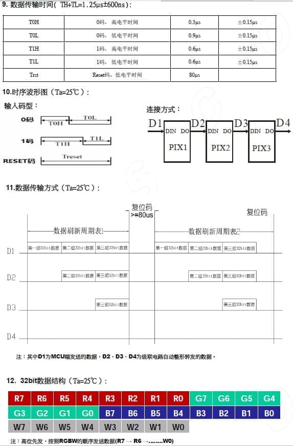 数据协议采用单极性归零码的通讯方式,像素点在上电复位以后,DIN端接受从控制器传输过来的数据,首先送过来的32bit数据被**个像素点提取后,送到像素点内部的数据锁存器,剩余的数据经过内部整形处理电路整形放大后