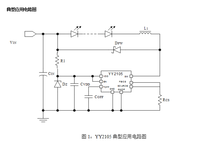 YY2105 是一款高效率,降压型高亮度LED灯恒流驱动芯片。内置100VMOS管,尤其适合宽输入电压范围的LED 驱动。YY2105 采用固定关断时间的峰值电流控制方式,其工作频率*高可达1MHz,适合单电压应用,可使外部电感和滤波电容体积减小,效率提高,节省PCB 面积。关断时间*小为620ns,并可通过外部电容进行调节,工作频率也可根据用户要求进行调节。在EN端加PWM 信号,可调节LED 灯的亮度。YY2105 通过调节外置电流检测电阻的阻值来设置流过LED 灯的电流,从而设置LED 灯的亮度,流过LED 灯的电流可从几十毫安到2A变化。YY2105可做线性调光,采用底部散热片ESOP-8封装。散热片内置接SW脚