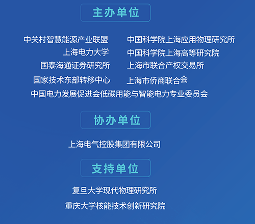 - 主办单位:中关村智慧能源产业联盟|中国科学院上海应用物理研究所|上海电力大学|中国科学院上海高等研究院|国泰海通证券研究所|上海市联合产权交易所|国家技术东部转移中心|上海市侨商联合会|中国电力发展促进会低碳用