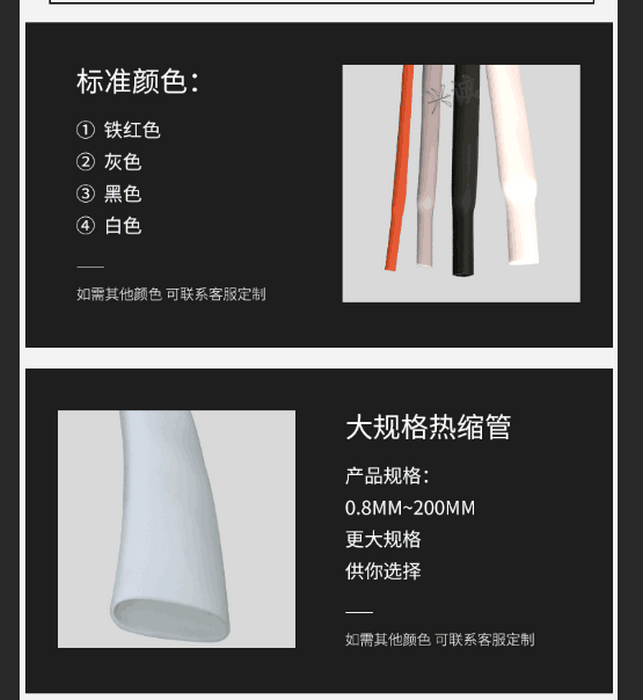 硅橡胶热缩套管是针对电子零件的绝缘、保护而设计开发的产品。热缩套管加热时,套管内径迅速收缩一半,将被保护的电子部件紧紧包覆在套管内,而不受外界环境的影响。 应用一般应用于医疗器械、家用电器、航天##、军工、汽车制造、电子元器件、变压器、马达等。电子元件等的绝缘、保护、包覆等的一种新型热缩产品。 加热后套管内径迅速收缩至一半,将被保护的电子部件紧紧包覆在套管内,而不受外界环境的影响。其不仅具有一般硅胶管本身优良的性能,耐高温、耐高压、柔软且富有弹性,还兼具有热收缩性能,良好的耐刺扎损伤机械性能。与普通热缩套管###优点是 耐温等级高,可高达200℃。