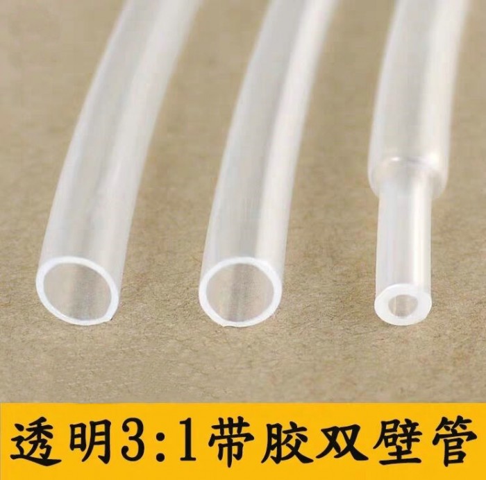 透明双壁管内层是热熔胶,具有良好粘接性能,外层为柔软阻燃辐照交联聚烯烃,其收缩倍率达3倍,收缩后热溶胶能将连接两端的材料完全密封,易施工、不需保养,能耐恶劣环境、湿气等冲击,达到保护零组件作用。