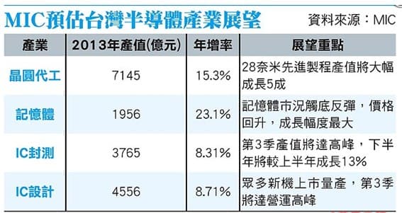 资策会产业情报研究所(MIC)预估,在智慧手机以及平板电脑等智慧型手持装置快速成长激励下,今年台湾半导体产业表现将逐季成长,全年达到13的年增率。其中记忆体市况触底反弹、价格回升,全年产值将大增23.1幅度高,IC封测与设计产业随着晶圆代工需求热络与新机上市带动,将于第3季达到营运高峰。