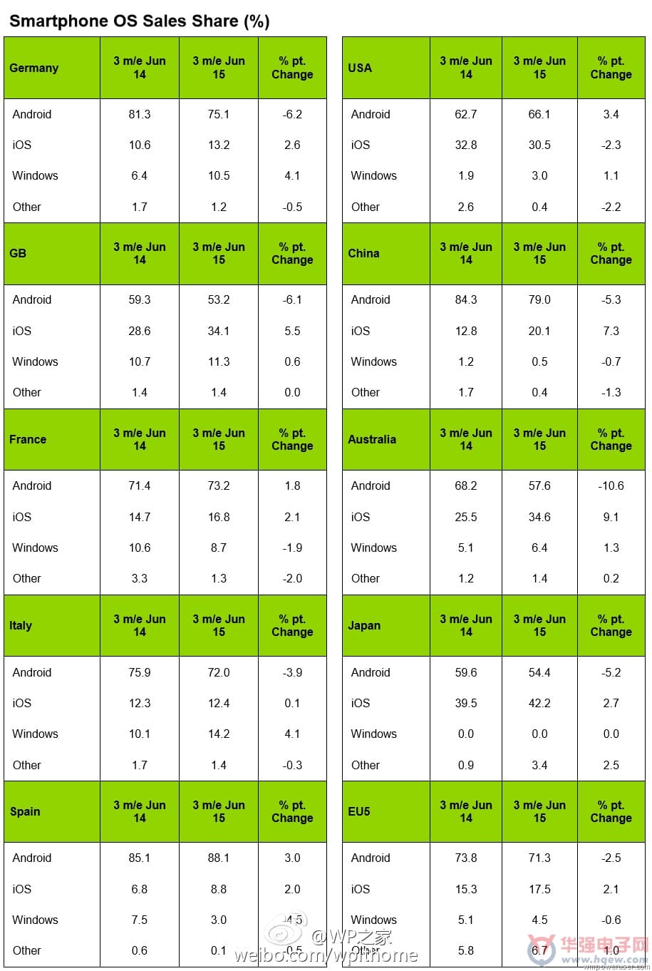 数据显示,英国Windows Phone份额继续增长,到11.3%;但是法国受到挫折,降至8.7%;意大利WP销售情况正在好转,份额上涨到14.2%;德国Windows Phone手机也取得不错的成绩,份额为10.5%。
