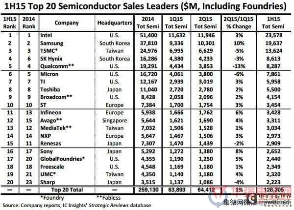 IC Insights的2015上半年全球前二十大半导体供应商排行榜(包含晶圆代工业者)
