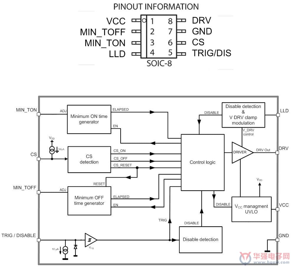 NCP4305可采用SOIC-8、DFN8和WDFN8三种封装。MIN_TOFF 和MIN_TON引脚通过连接电阻到地,调节*小关断和*小导通时间。LLD引脚用于在轻载时调节驱动器钳位电平,或关断驱动器。DRV引脚是同步整流MOSFET的驱动器输出。CS(电流采样检测)引脚用于检测电流是否流过同步整流MOSFET。TRIG/DIS引脚提供超快关断输入,用作在CCM应用中关断同步整流MOSFET以提升能效,当上拉超过100 us时激活禁用模式。