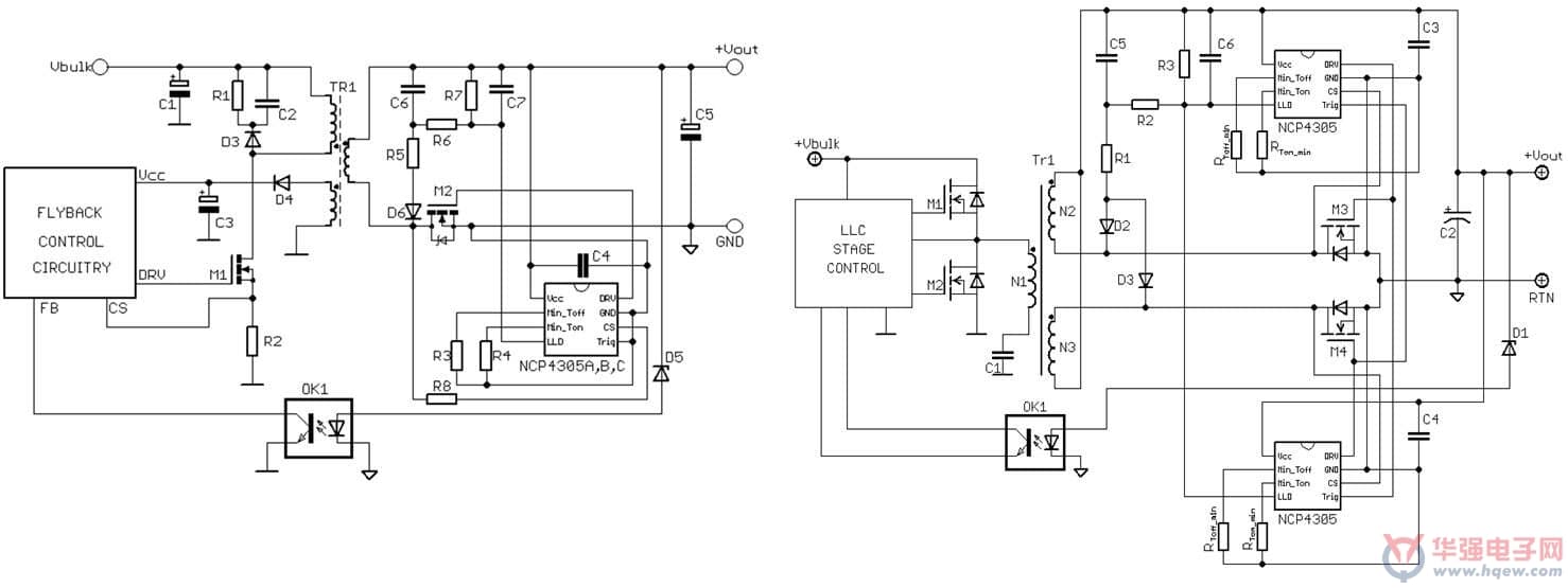图2. NCP4305 Flyback或QR应用原理图(左)和LLC应用原理图(右)