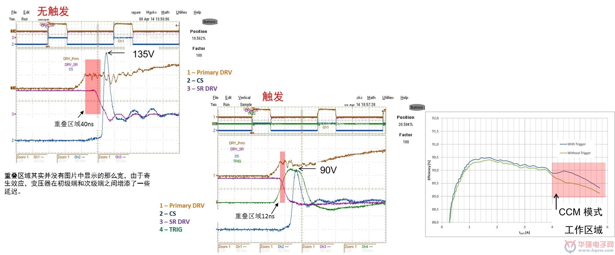 在CCM应用中,当初级端MOS管导通时,通过隔离驱动器强制使次级端MOS管关断;当初级端MOS管关断, TRIG脚功能使次级端MOS管导通。这种交替导通特性大大提高系统能效。如图5所示,无触发功能的初级端和次级端驱动信号交叠的时间为40 ns,远大于带触发功能的12 ns,也就是说,触发功能将缩短延迟时间,从而降低损耗。