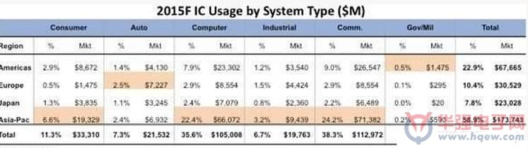 2015年各地理区与应用市场的IC用量预估(单位:百万美元)