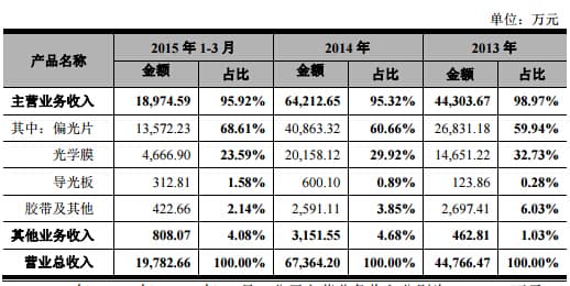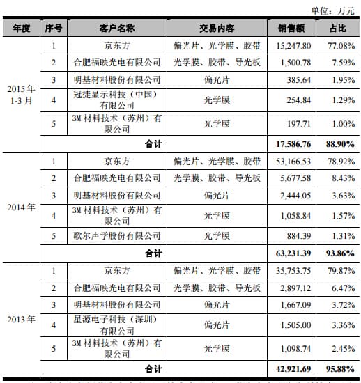 翰博高新主营业务为光电显示薄膜器件的研发、生产和销售,主要产品为偏光片、光学膜、导光板、光电显示用胶带等光电显示薄膜器件。公司作为京东方国内主要配套企业之一,销售收入主要来自京东方。2013年、2014年、2015年1-3月,公司向京东方销售产生的营业收入分别为35,753.75万元、53,166.53万元、15,247.80万元,占营业收入比例分别为79.87%、78.92%、77.08%。