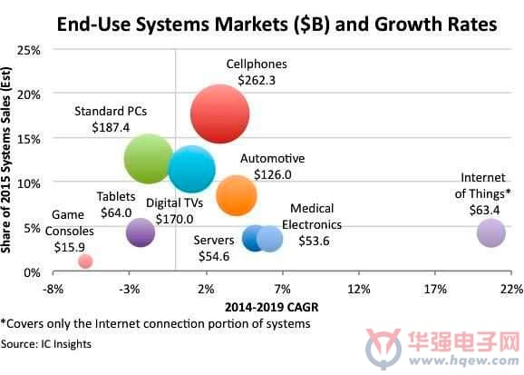 物联网系统市场(IoT)则预期是到2019年之间平均年成长率*高的电子系统产品类别,除了此类产品,没有其他系统类别可达到7%以上的平均年成长率;甚至包括标准PC、平板电脑以及游戏机等系统产品市场产值,在预测期间恐怕都将呈现衰退。