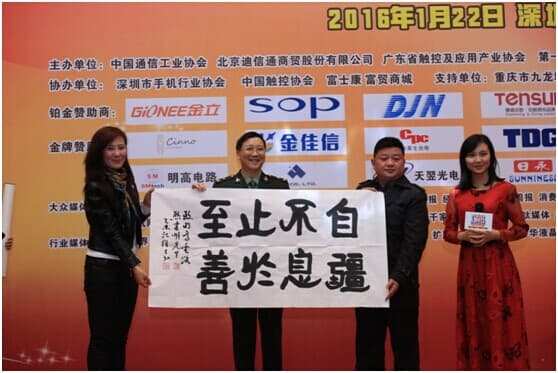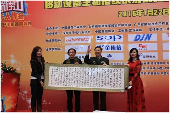 此外,江杰生将军作为特邀嘉宾为2015中国好手机颁奖典礼及晚宴题词庆祝,并在晚宴现场分别赠与智科通讯(IPRO)董事长涂皓、明高电路版总经理熊建明所喜爱的将军本人书法作品。