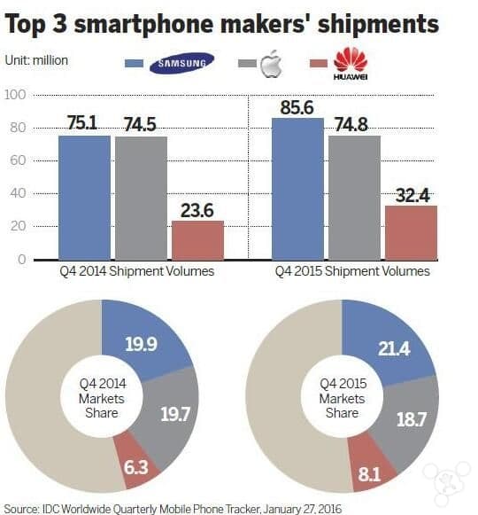 再看全球智能手机市场,三星的出货量始终超过苹果毋庸置疑,不过尽管华为2014年第四季度的出货量只有苹果的三分之一,但到了2015年第四季度的出货量却上升到了苹果的一半。数字上看华为超过苹果还有些时日,若是考虑到华为市场份额扩大的速度是如此迅速,追上处于下滑的苹果时间将会大幅缩减。
