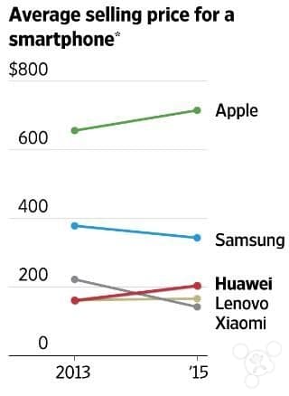 华尔街日报数据,国内各品牌智能手机平均售价: