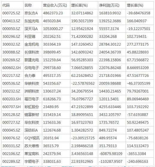 2015年显示器件行业20家A股上市公司营业收入及净利润一览