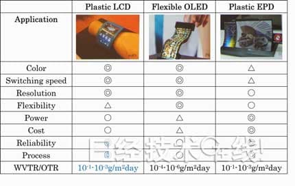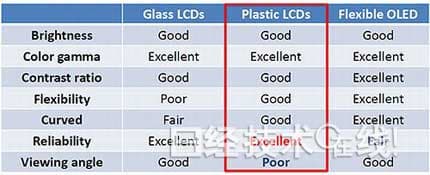 表1:两种液晶显示器与柔性OLED显示器的比较