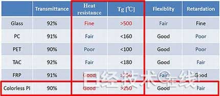 表2比较了基板材料。进行比较的基板材料有玻璃、聚碳酸酯(PC)、聚对苯二甲酸乙二醇酯(PET)、三醋酸纤维素(TAC)、纤维强化树脂(FRP)及无色聚酰亚胺(PI)。比较的特性包括透过率、耐热性、玻璃化转变温度(℃)、柔性及相位差。