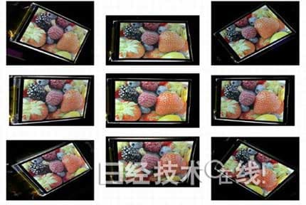 表3是试制的薄膜液晶屏的性能参数。画面尺寸为2.95英寸,像素为数640480(VGA),精细度为271ppi,液晶的元件结构为FFS,面板厚400μm,色彩表现性为NTSC比72%,对比度为860比1。薄膜液晶显示器的层结构和显示示例见图2。图3是在演示面板的视角依赖性,可以看出为大视角。