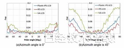 图4比较了IPS模式树脂液晶显示器、IPS玻璃基板液晶显示器及VA模式液晶显示器的色偏。可以看出树脂液晶屏的色偏与采用普通玻璃基板的IPS模式液晶屏为相同水平。