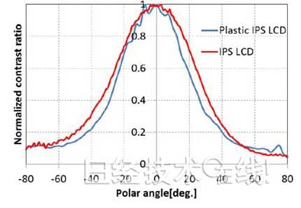 图5比较了对比度的视角依赖性。采用树脂基板的IPS模式液晶面板与采用普通玻璃基板的IPS模式液晶面板为同等水平。实施了光学补偿的树脂液晶显示器实现了大视角。