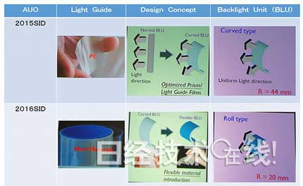 图7是AUO的树脂液晶显示器用背照灯单元(BLU)的开发历程。该公司在SID 2015上已经发布了任何方向都能获得均匀特性的弯曲型BLU。导光材料采用PC(聚碳酸酯),通过优化棱镜膜和导光膜,开发出了这种弯曲型BLU,曲率半径R为44mm。在2016年的SID上,该公司发布了采用柔性材料开发的卷绕型BLU。与1年前的弯曲型BLU相比,此次该公司将其定位为柔性BLU,曲率半径R为20mm。