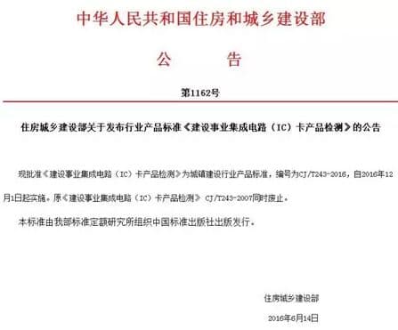 近日,国家工程建设标准化信息网公布中华人民共和国住房和城乡建设部(第1162号)文件。文件指出,《建设事业集成电路(IC)卡产品检测》(CJ/T 243-2016)行业产品标准(以下简称“标准”)发布,并于2016年12月1日起正式实施,原《建设事业集成电路(IC)卡产品检测》(CJ/T 243-2007)同时废止。该标准由住房和城乡建设部信息技术应用标准化技术委员会归口,住房和城乡建设部IC卡应用服务中心、中外建设信息有限责任公司会同有关单位共同起草。