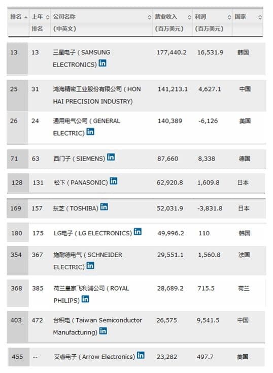 经过梳理发现,从产业角度来看,其中涉及照明行业或LED领域的企业包括三星电子(排名13)、鸿海精密(排名25)、美国通用电气(排名26)、西门子(排名71)、松下(排名128)、东芝(排名169)、LG电子(排名180)、施耐德电气(排名354)、皇家飞利浦公司(排名368)、台积电(排名403)、艾睿电子(排名455)均入选了排行榜。上榜的这几家企业有的属于照明电工领域,有的则涉足半导体及半导体设备领域。