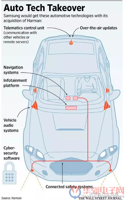 这正是三星利用收购哈曼国际所要开拓的领域。哈曼国际高管迈克·塔扎马洛克斯(Mike Tzamaloukas)在今年初表示,公司希望在互联网汽车生产过程中扮演重要角色。他表示,互联网汽车将是半自动驾驶汽车乃至全自动驾驶汽车的催化剂。