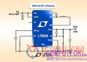 凌力尔特 (Linear Technology Corporation) 日前推出 600mA、能接受 100V 输入的同步降压开关稳压器 LT8630。该元件的同步整流可提供高达 93% 的效率,同时在无负载备用情况下採用Burst Mode? 运行可将静态电流保持低于 7μA。 3V 至 100V 输入电压範围使该元件非常适合 48V 汽车系统、双电池交通运输、工业和 36V 至 72V 电讯应用。元件内部的高效率开关可在电压低至 0.8V 时提供高达 600mA 的连续输出电流。LT8630 的Burst Mode运行可实现超低静态电流,因此非常适合汽车always-on系统等需要延长电池寿命的应用。LT8630 的独特设计可保持*低压差电压,使该元件能够以高达 99% 的工作週期操作。可变频率边界模式开关架构可在宽广的输入电压範围内实现高效率。LT8630 具备高压接脚间隔的 20 接脚 TSSOP 封装可为高压应用提供精小和具备高散热效率的解决方案。