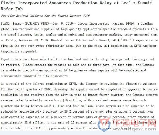根据外网找到的消息来源,事件发生于11月18日,Diodes位于美国密苏里州的Lee's Summit(利斯萨米特,“KFAB”) 晶圆厂发生火灾,事故区域为该工厂的湿法刻蚀晶圆制造区。因为这场火灾,位于KFAB工厂的所有产品将全部暂停供应。 diodes-2 目前,该工厂已提交了维修计划,但是具体的恢复时间还尚不明确。受此事件影响,该公司已重新修订了其2016第四季度的财务摘要,修订收入调为2.22亿美元至2.38亿美元,预计将会造成1000万美元的业绩亏损。