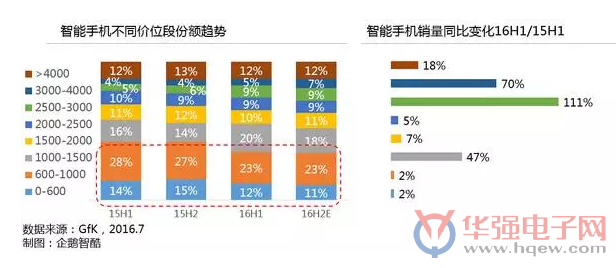 4.国产品牌发力高端手机,中、低端机下沉至三四线及以下城市和农村地区。自2015下半年起,消费升级成为市场核心驱动力,中国手机市场进入“价值转型”阶段。售价在2000-3000人民币的市场成长*快,售价在1500元以下的市场则持续萎缩。同时,农村地区存在大量的换机需求,成为各大手机厂商的重点关注对象。经过七八年深耕,OPPO、vivo渠道已做到乡镇一级夫妻店的精细化程度。