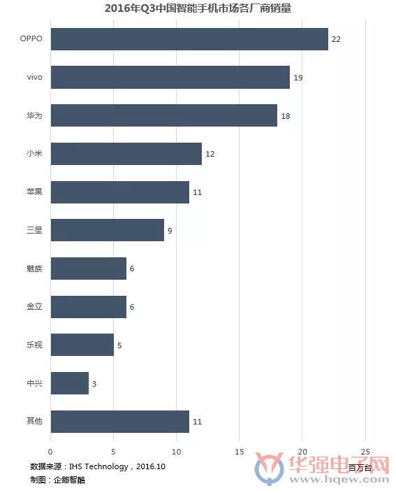 IHS Technology数据显示,2016年第三季度中国智能手机市场销量为1.23亿台,较去年同期增长15%。OPPO首次成为中国智能手机市场的季度排名**,vivo凭借X7的热销排名第二,华为(含荣耀)排名第三,小米和苹果分列第四、第五。三星则由于note7爆炸事故而被甩出了中国市场前五。