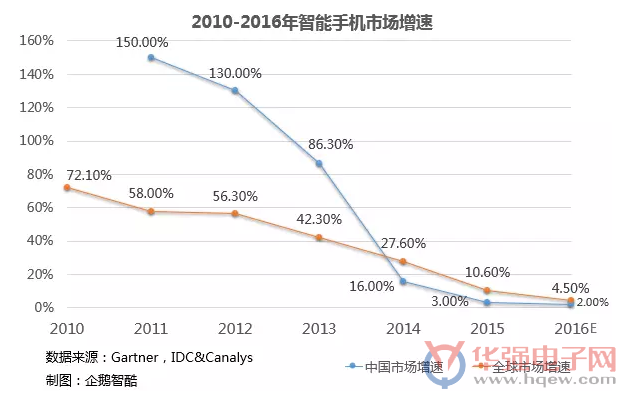 自2010年以来,全球和中国智能手机市场增速持续下降。IDC数据显示,2016年**季度全球智能手机出货量与去年同期相比仅增长0.2%,创下历年来*小同比增幅。Canalys数据则显示,这一时期全球智能手机出货量低于去年同期,自1996年智能手机诞生以来全球出货量首次出现同比收缩。尽管二者数据有异,但全球智能手机市场增速下降的趋势是一致的。