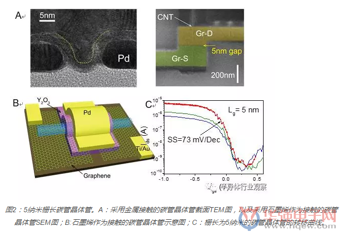 课题组进一步探索5nm栅长(对应3纳米技术节点)的碳管晶体管。采用常规结构制备的栅长为5纳米的碳管晶体管容易遭受短沟道效应和源漏直接隧穿电流影响,即使采用超薄的高k栅介质(等效氧化层厚度0.8纳米),器件也不能有效地关断,SS一般大于100mV/Dec。课题组采用石墨烯作为碳管晶体管的源漏接触,有效地抑制了短沟道效应和源漏直接隧穿,从而制备出了5纳米栅长的高性能碳纳米管晶体管,器件亚阈值摆幅达到73mV/Dec。