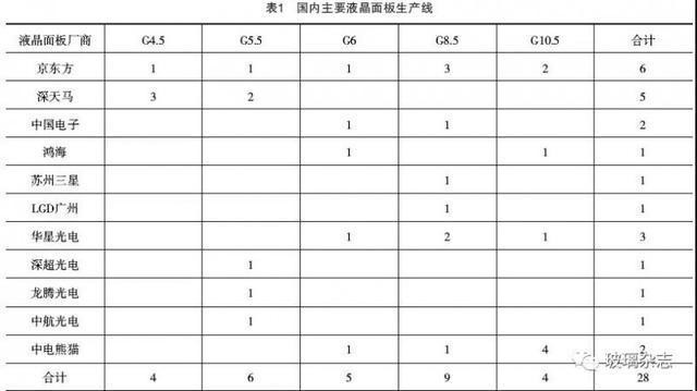 调研机构IHS预计,液晶电视、桌面显示器、笔记本电脑及其他大尺寸面板应用显示屏玻璃单元需求量在2016年呈下降趋势。尽管单元需求量在下降,但是面板厂商所生产的液晶显示屏幕尺寸正在扩大,显示屏基板玻璃需求仍将持续增加,当前整体基板玻璃产量能够匹配液晶面板的需求。表1列出了国内主要液晶面板生产线。