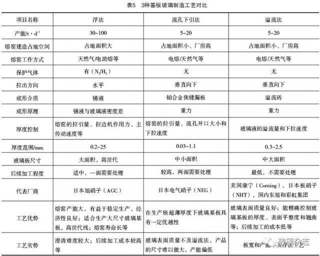 目前基板玻璃的制造工艺主要有浮法、流孔下引法和溢流法3种。流孔下引法的玻璃成形时直接接触金属滚轮,导致玻璃双面质量不高,需要后续抛光处理,加工难度较大,因此该法生产的玻璃不适合应用于TFT-LCD 液晶面板产业。美国康宁公司的溢流法成型工艺是目前生产TFT-LCD用基板玻璃的主要生产方法,该法成形时玻璃板表面仅与空气接触,形成自然表面,表观质量很高,但缺点是难以做高世代大尺寸基板玻璃,且产能小。日本旭硝子发展了浮法制造TFT-LCD基板玻璃的技术,浮法工艺易于扩大基板玻璃面积,降低单位成本,但在锡槽成型时接触液态锡的一面仍需要抛光处理去除锡层。3种基板玻璃制造工艺对比见表5。
