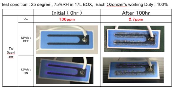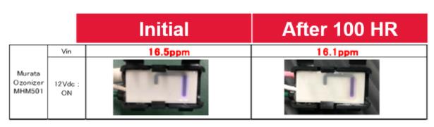 拿了国内品牌T的一款臭氧发生器做的实验,结果在100小时的工作时间之后,其产生的臭氧密度在空间内降到了原数值的2%,衰减率高达98%。而据资料显示,国际上,对于常规臭氧发生器的平均使用寿命需求是1000Hrs。村田在对外的产品推介上,也展示了其发生器100小时后的臭氧密度依然可以维持在97.6%左右的均线上下。