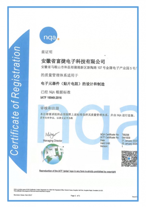 在进行产品规划同时,富捷电子加速技术研发和资源整合,斥巨资购买美式,日式等先进仪器设备,为车规产品建实验室,已经完全有能力因应AEC-Q200等车规的要求推出系列应用于汽车电子的车规电阻产品。同时,富信半导体&富捷电子皆已顺利获取IATF16949:2016质量管理体系认证,不仅标志着安徽富信旗下产品已经正式取得进入汽车供应链的通行门票,也预示着安徽富信在未来发展中能够更好的开拓国际汽车零部件市场、提升企业核心竞争力。
