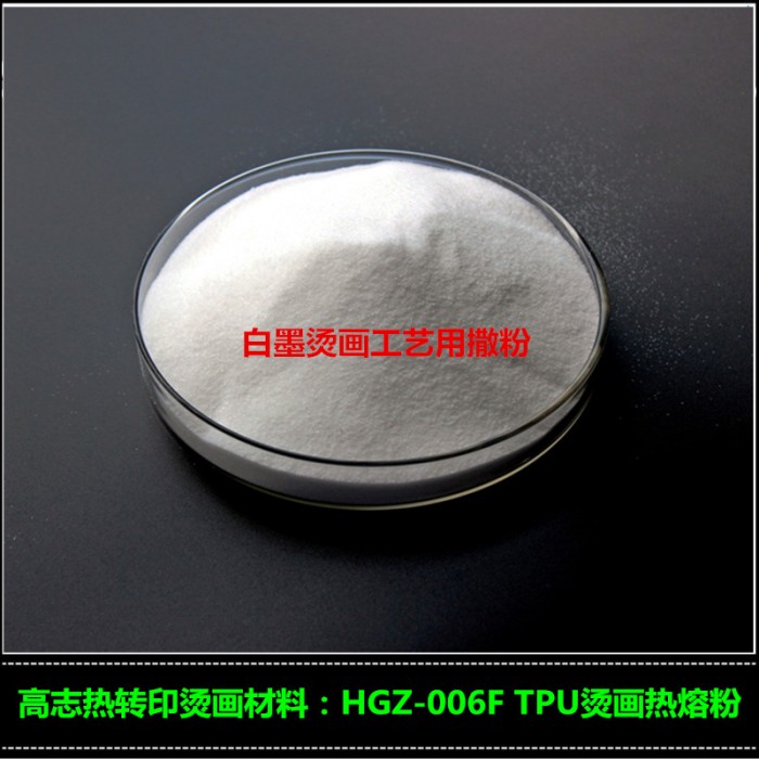 应用于白墨烫画工艺,作为撒粉使用,为白墨烫画打印的图案提供粘性,在打印机的烤箱中115℃~135℃的温度区间内,热熔粉会在5-10分钟内融化成胶状,与打印机打出来的图案融合在一起。这款热熔粉分为粗粉(HGZ-006F-C)与细粉(HGZ-006F)两种,粗粉应用于白墨烫画工艺。颗粒均匀,适合机器撒粉和手工撒粉。细粉可以添加在热熔胶中,增强粘性,同时也可以增强烫画图案的弹性。
