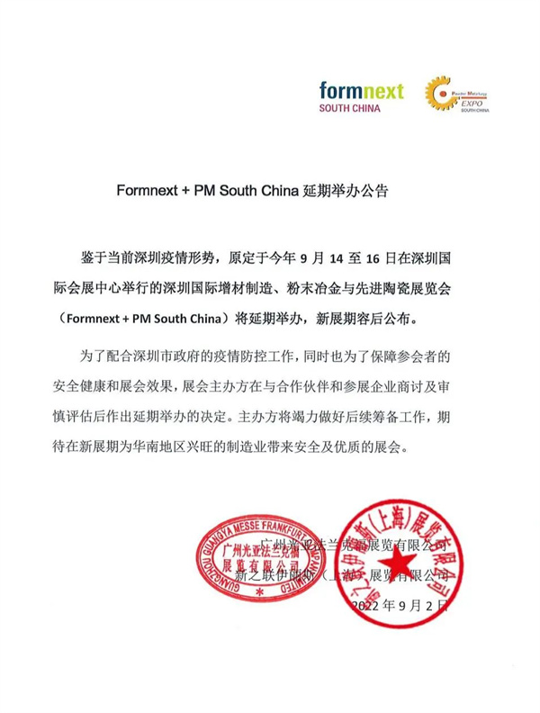 鉴于当前深圳疫情形势,原定于今年9月14至16日在深圳国际会展中心举行的深圳国际增材制造、粉末冶金与先进陶瓷展览会(Formnext + PM South China)将延期举办,新展期容后公布。