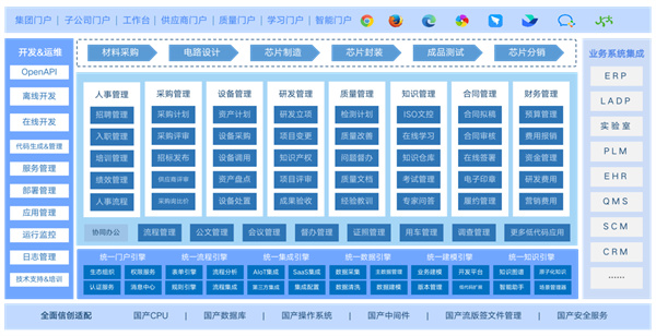 基于集成电路企业管理需求与数字化应用趋势,蓝凌整合行业的门户、BPM流程、低代码等能力,形成“全新基座+场景应用”的集成电路企业数字化办公解决方案,支撑供应商门户、研发门户、人事流程、质量流程、合同流程等应用,加速企业数字化转型与发展。