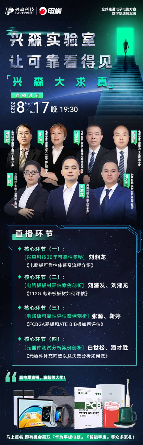 8月17日晚19:30,《兴森大求真》之“兴森实验室,让可靠看得见”正式开播!多名行业大咖将组成“可靠智囊团”来到直播现场强势助阵。届时,诸位专家将围绕电路板可靠性体系,结合先进电子电路案例进行分享,全方位为您答疑解惑,带你实景走进兴森实验室,让可靠看得见!