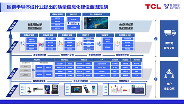 围绕半导体设计业的业务特点,赵志提出了质量信息化建设蓝图规划,涵盖应用、执行、管理、决策四个层面,构建全生命周期质量数字化系统。作为脱胎于半导体制造业的国家级双跨工业互联网平台,格创东智基于物联网、大数据、人工智能等三大核心平台能力,将AIoT技术应用至数据集成、系统集成、业务流程集成,实现AI助力数据决策,构建了数字化质量解决方案。