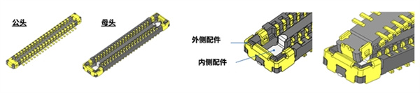该连接器通过在产品两端的外侧和内侧配置适合各自功能的2个金属零件的特有构造,提高了装配工作时的导入性,缩短了操作时间。此外,通过在基板上焊接各金属零件,提高了抗变形和抗损坏的能力。