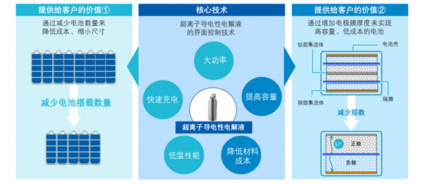 ※2 电解液配制技术:将拥有各种功能的电解液成分混合,发掘所需锂离子电池电解液功能的技术