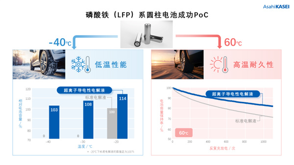 旭化成使用磷酸铁(LFP)系圆柱电池实施了面向实际应用的PoC,验证出电池在-40℃的极低温下也能实现高输出,并且在60℃的高温下也拥有高充放电循环耐久性。旭化成今后将加强与汽车制造商及LIB制造商的协作,目标是2025年实现实际应用。