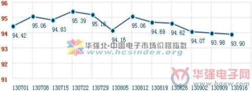 本期华强北电子市场综合指数继续走低,收于93.90点,下跌0.08点,跌幅不足0.10.旗下四板块电子元器件和数码产品价格指数下跌,跌幅分别为0.52和0.29;手机和IT产品指数则分别上涨1.41和0.46.